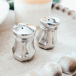 Our charming mini salt + pepper set in a vintage pewter finish brings old world charm to your table.