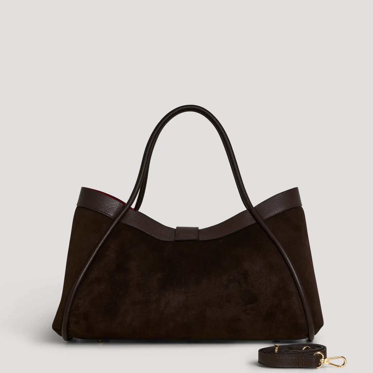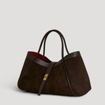 Italian luxury for the cooler months. Crafted in dark brown suede, the Mayfair Bag seamlessly transitions from office to evening. Its generous capacity holds your laptop and essentials with ease, while the adjustable shoulder strap ensures comfort throughout your day. An ingenious internal chain allows you to reshape the bag for different occasions, making it a sophisticated investment piece that evolves with your needs.