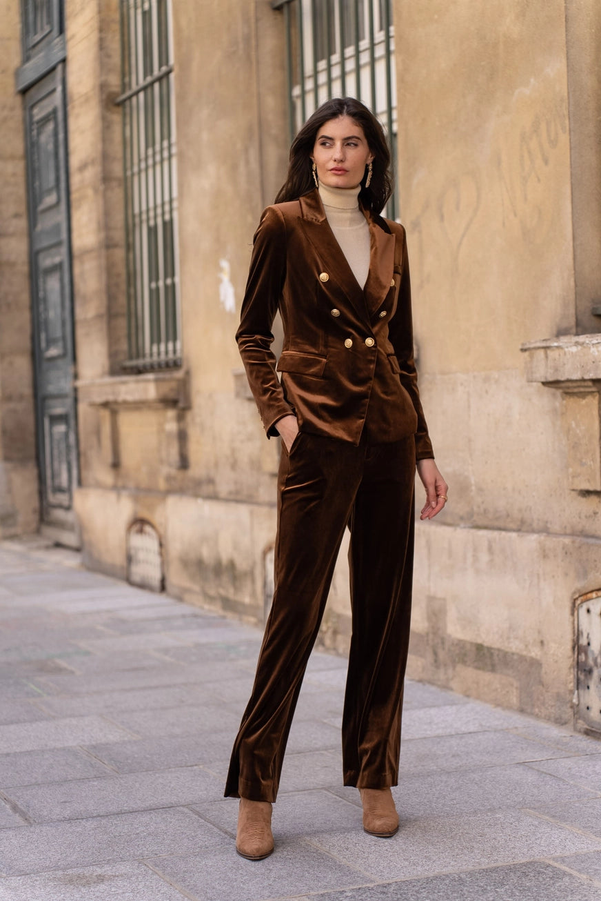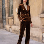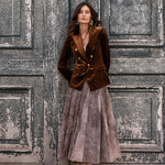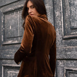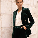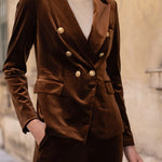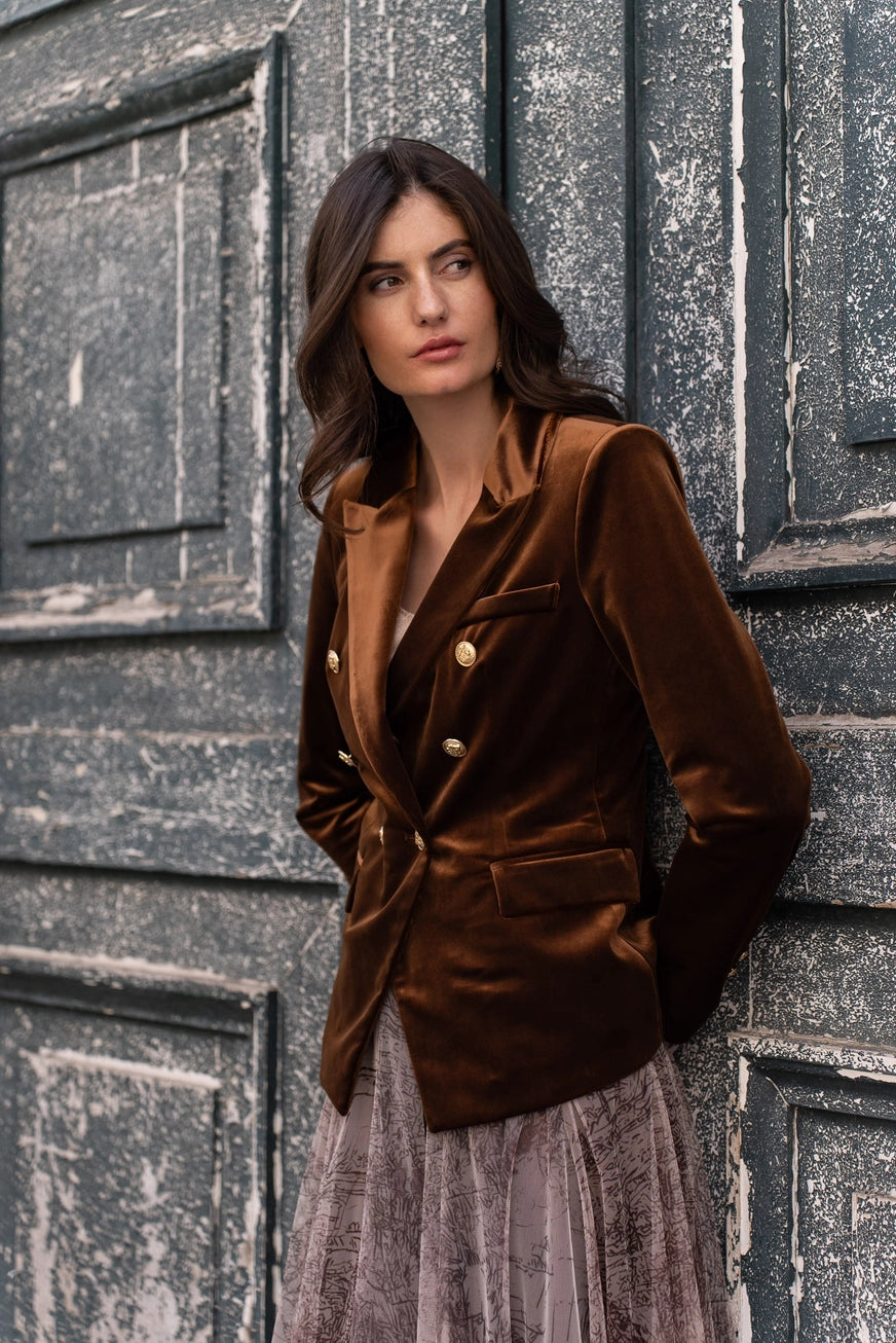 Our semi-fitted velvet blazer is the standout of the season. Easily elevate any dress or trousers for a chic, sophisticated appearance. Designed with a double-breasted front and striking gold buttons, it’s the perfect addition to your winter wardrobe. Choose from Chocolate or Forest Green.